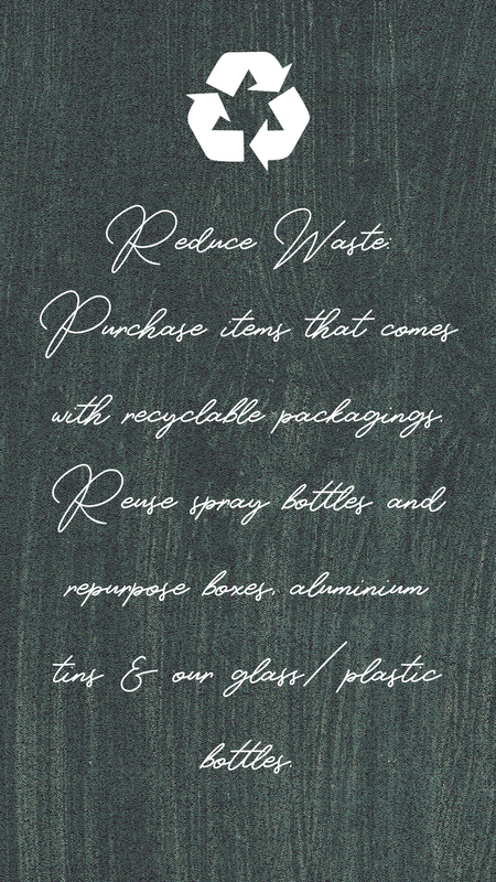 Our packagings are recyclable and gift sets inserts are scraps of papers left by printing stuff. We strongly urge our customers to reuse, repurpose or recycle our amber bottles and aluminium tins. The essential oils we used are sourced from manufacturers who believed in supporting local farmers. Let's all play our part in decreasing our carbon footprints.
